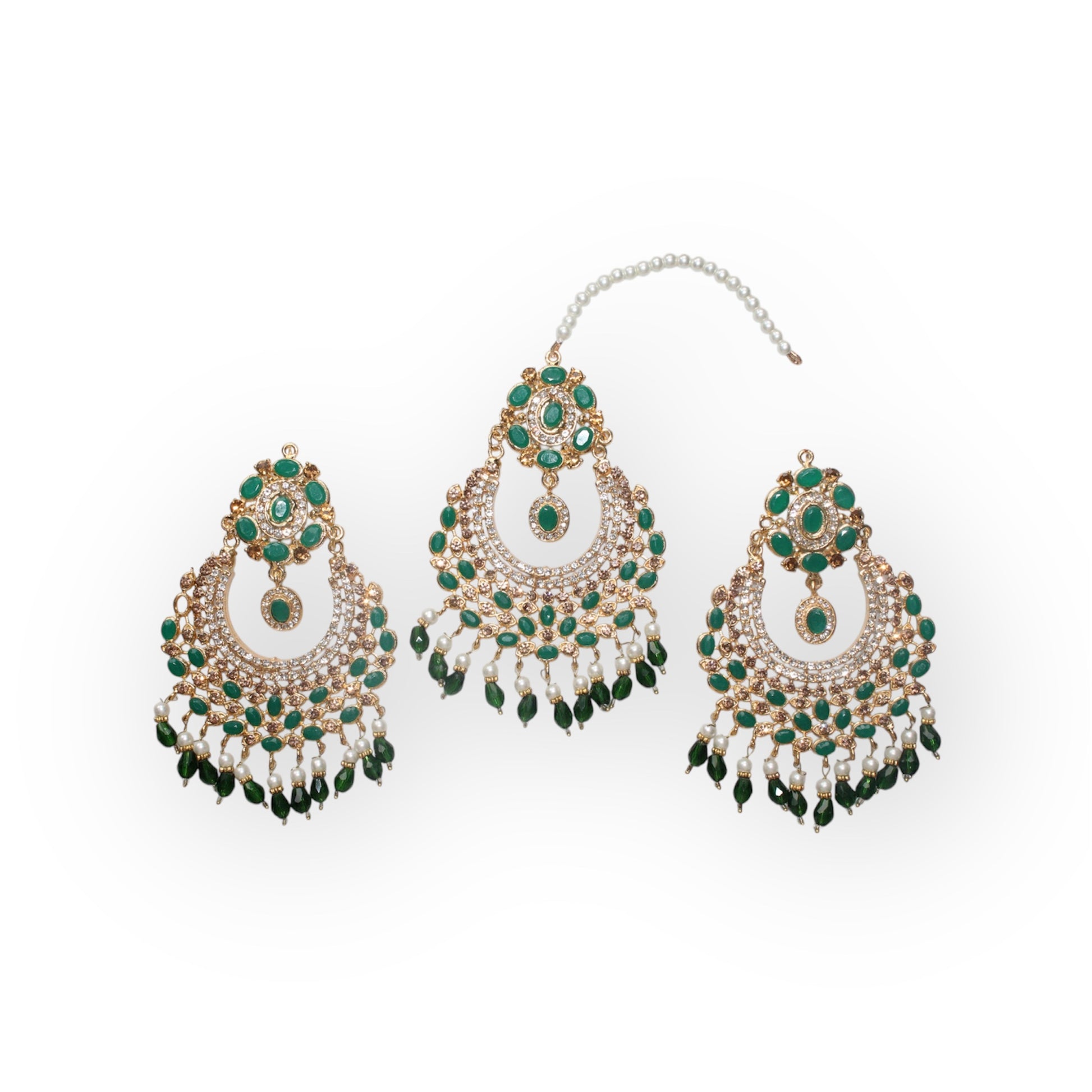 This Set comes in different colours and consists of two earrings and one headpiece. The String for the headpiece has white pearls and has a loop to pin it in place.