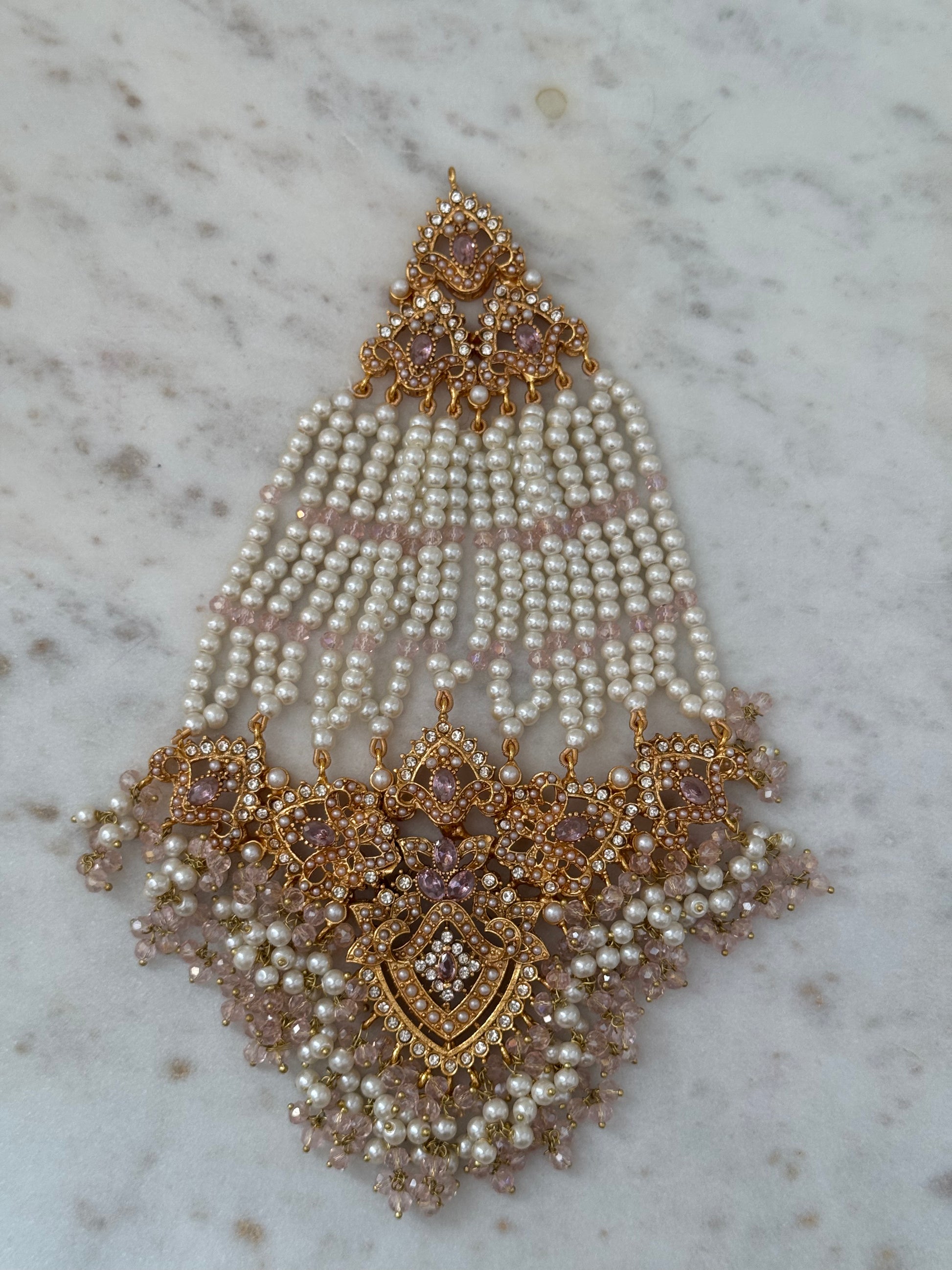 This luxurious bridal jewelry set exudes timeless beauty and sophistication, featuring a stunning blend of gold, white, and rose pearls. Carefully crafted to elevate your bridal look, the set is a perfect fusion of traditional South Asian design and modern elegance. It includes: