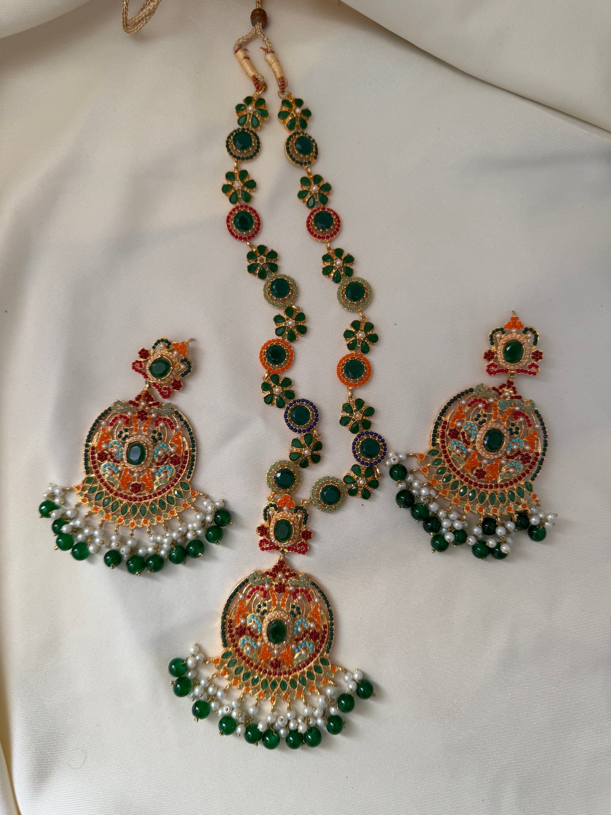 This Mala Set is Green and perfect for a Mehndi Outfit. It is a three piece Set with one Necklace and two earrings.